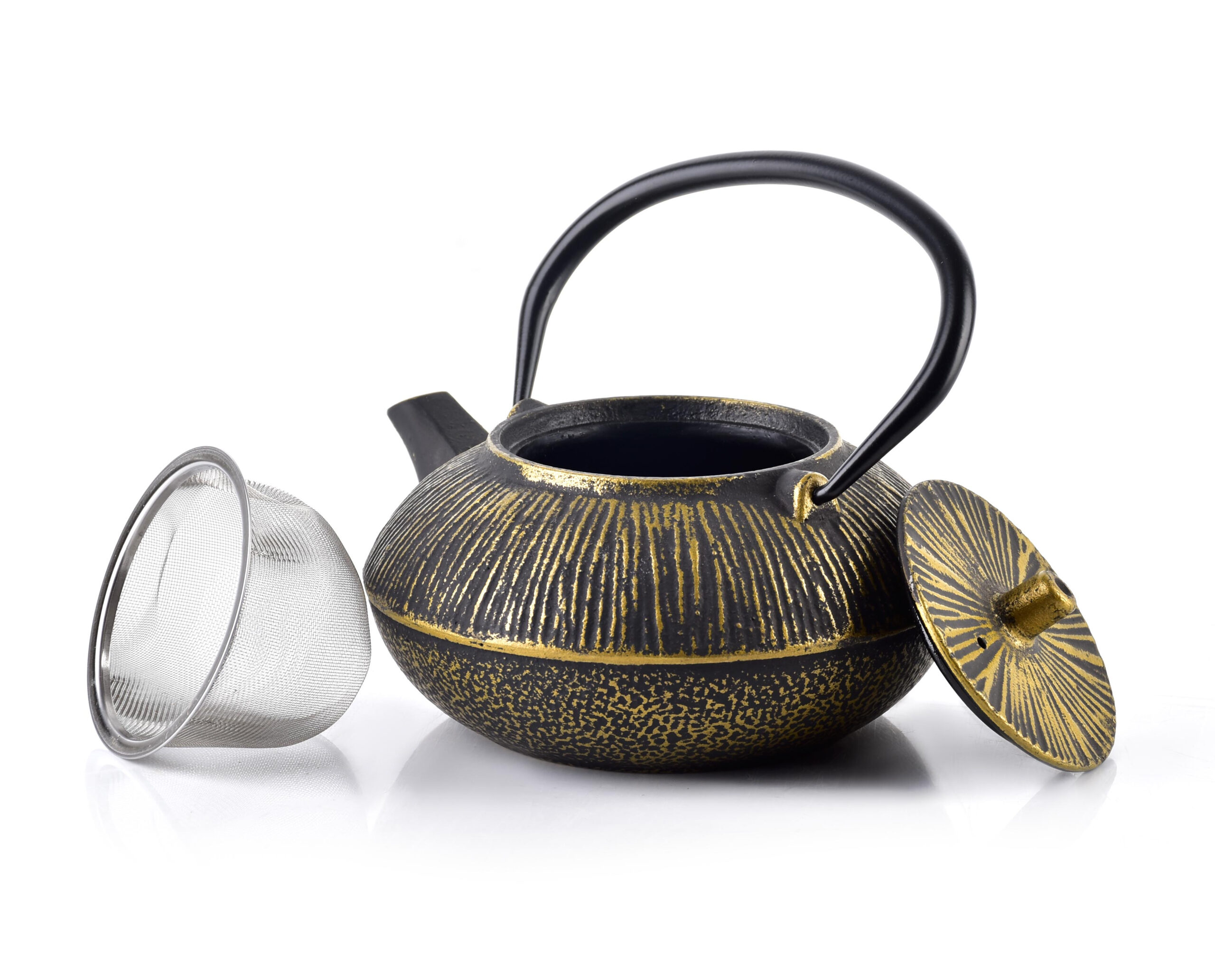 Dzbanek żeliwny z serii ALOR marki COOKINI by MONDEX został zainspirowany japońskim sposobem parzenia herbaty. Został wykonany z wysokiej jakości żeliwa z wytłaczanymi czarni złotymi paskami dekoracyjnymi. Posiada metalowy uchwyt oraz filtr ze stali nierdzewnej, do którego należy wsypywać liście herbaty lub zioła. Dzięki zastosowaniu sitka fusy nie przedostają się do naczynia i łatwo je usunąć po zaparzeniu. Wnętrze dzbanka pokryto emalią, aby zapewnić najwyższą jakość przygotowywanego napoju. Korzystając z dzbanka wydobędziesz oryginalny smakoraz będziesz delektować się autentycznymi przeżyciami zwiąanymi z ceremonią parzenia herbaty. wymiar dzbanka: 16x19xh16cmśrednica sitka: 8cmxh5cmśrednica pokrywki: 8cmśrednica spodu: 10cmodległość między uchwytem pokrywki a uchwytem dzbanka: 6cm Pojemność: 800 ml (bez włożonego sitka) zapakowany jednostkowo w czarny color box: 17x17xh10,5cmwaga:1,642kg/z opakowaniem 1,746kg OSTRZEŻENIA: 1. Przed pierwszym użyciem należy dokładnie umyć dzbanek oraz filtr gąbką oraz delikatnym detergentem . nie szorować. 2. Produkt należy myć ręcznie. Nie można myć w zmywarce, ani używać w kuchencemikrofalowej. 3. Unikać znacznych różnic temperatury cieczy. 4. Nie umieszczać bezpośrednio na ogniu. zmywarka: NIE