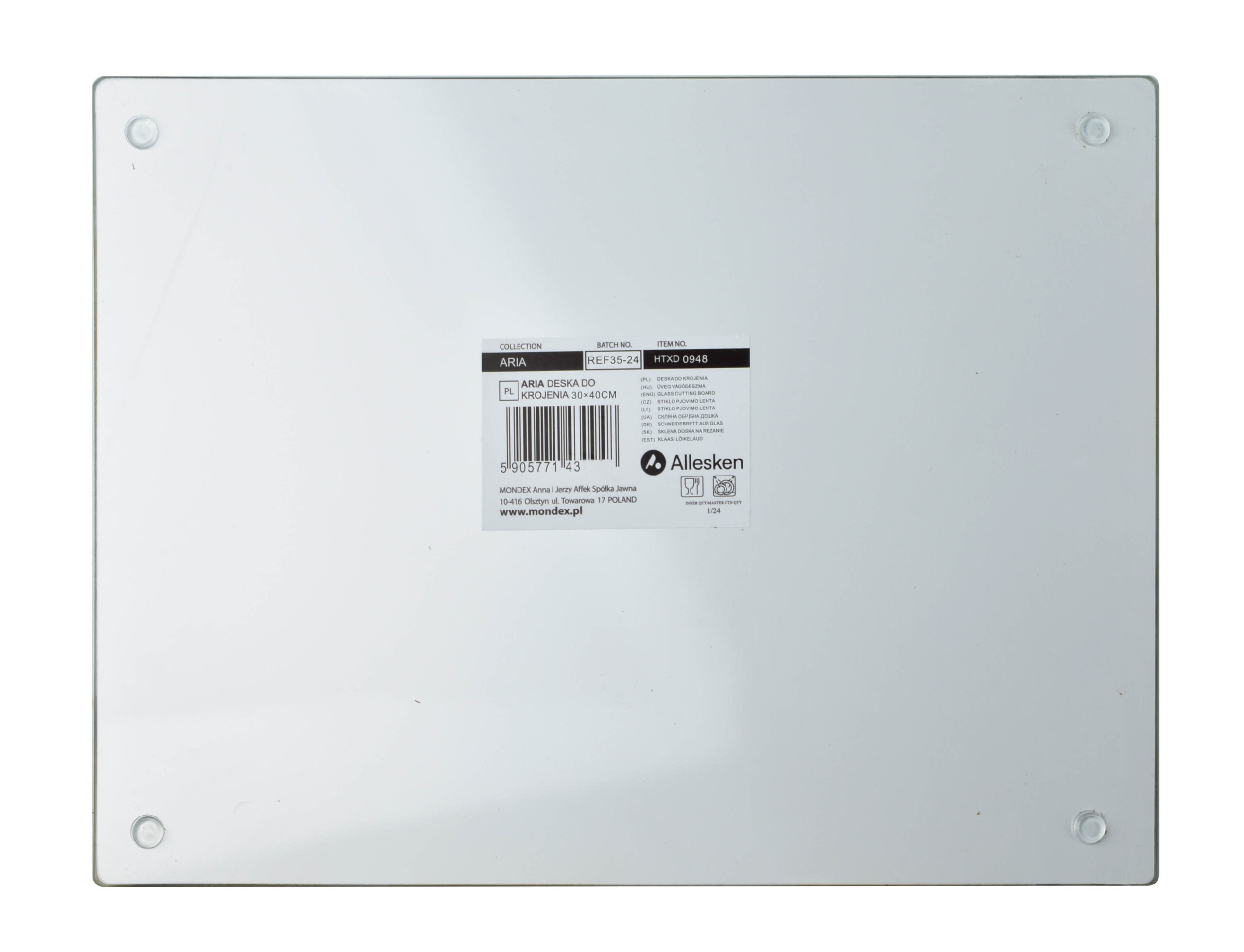 Deska szklana z kolekcji ARIA marki ALLESKEN to doskonałe połączenie funkcjonalności i eleganckiego designu. Wykonana z wysokiej jakości szkła, nie tylko jest wyjątkowo trwała, ale także łatwa w utrzymaniu czystości, co czyni ją idealną dla każdej nowoczesnej kuchni. Deska prezentuje się lekko i subtelnie, a jednocześnie jest odporna na odkształcenia i zarysowania, zachowując swój estetyczny wygląd przez długi czas. Antypoślizgowe stopy zapewniają stabilność podczas krojenia, a elementy ozdobne zkolekcji ARIA nadają desce wyjątkowy charakter, który wyróżni ją na tle standardowych akcesoriów kuchennych. Dzięki wymiarom deski, przygotowanie składników do różnorodnych potraw staje się niezwykle komfortowe, a jej uniwersalność umożliwia również wykorzystanie jej jako stylowej podstawki pod gorące naczynia lub efektowne prezentacji przekąsek podczas uroczystych przyjęć. wymiar: 40x30xh0,4cm waga: 1,144kg/1,232kg z opakowaniem opakowanie jednostkowe: eco box z okienkiem 30,5×40,5x1cm