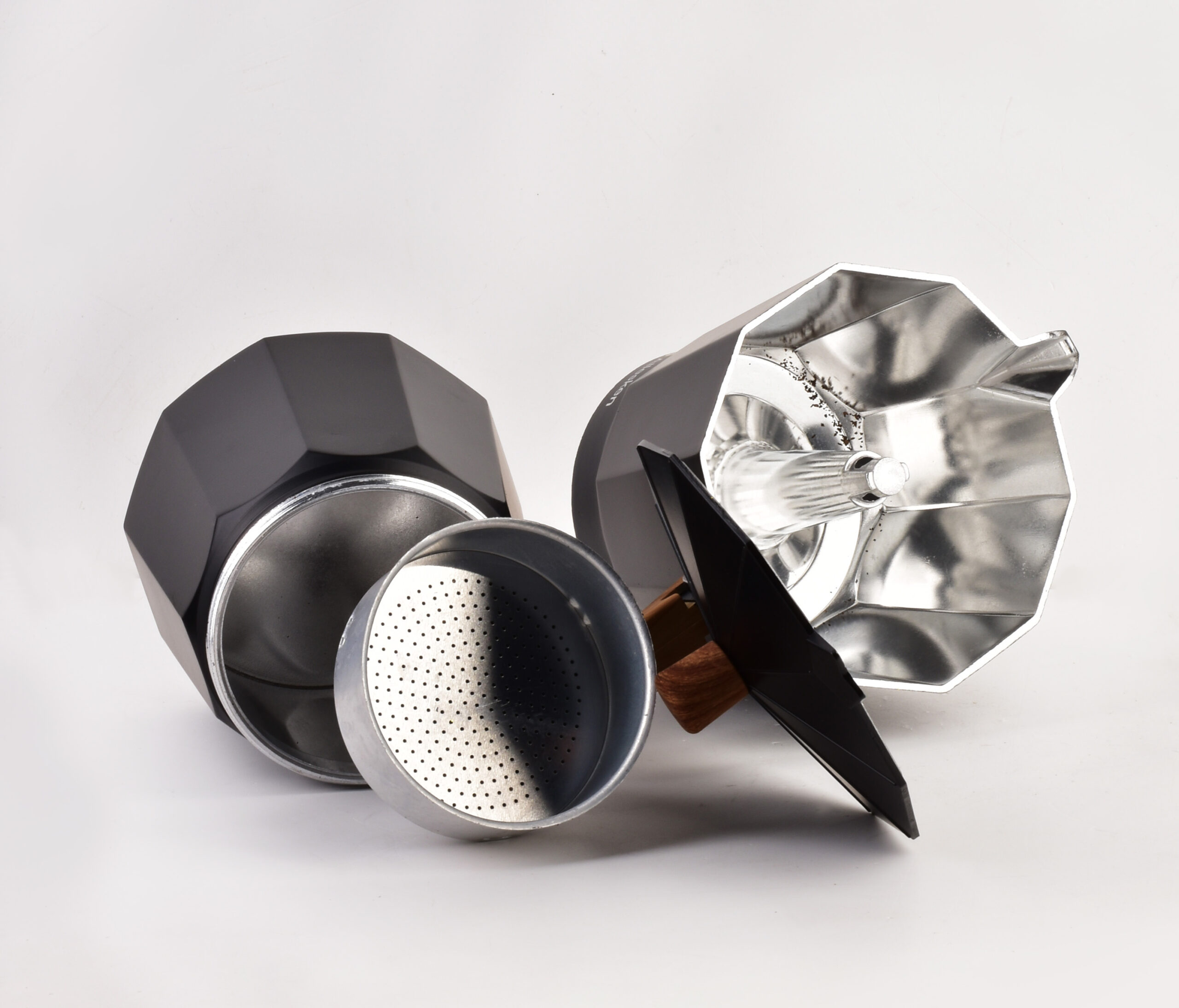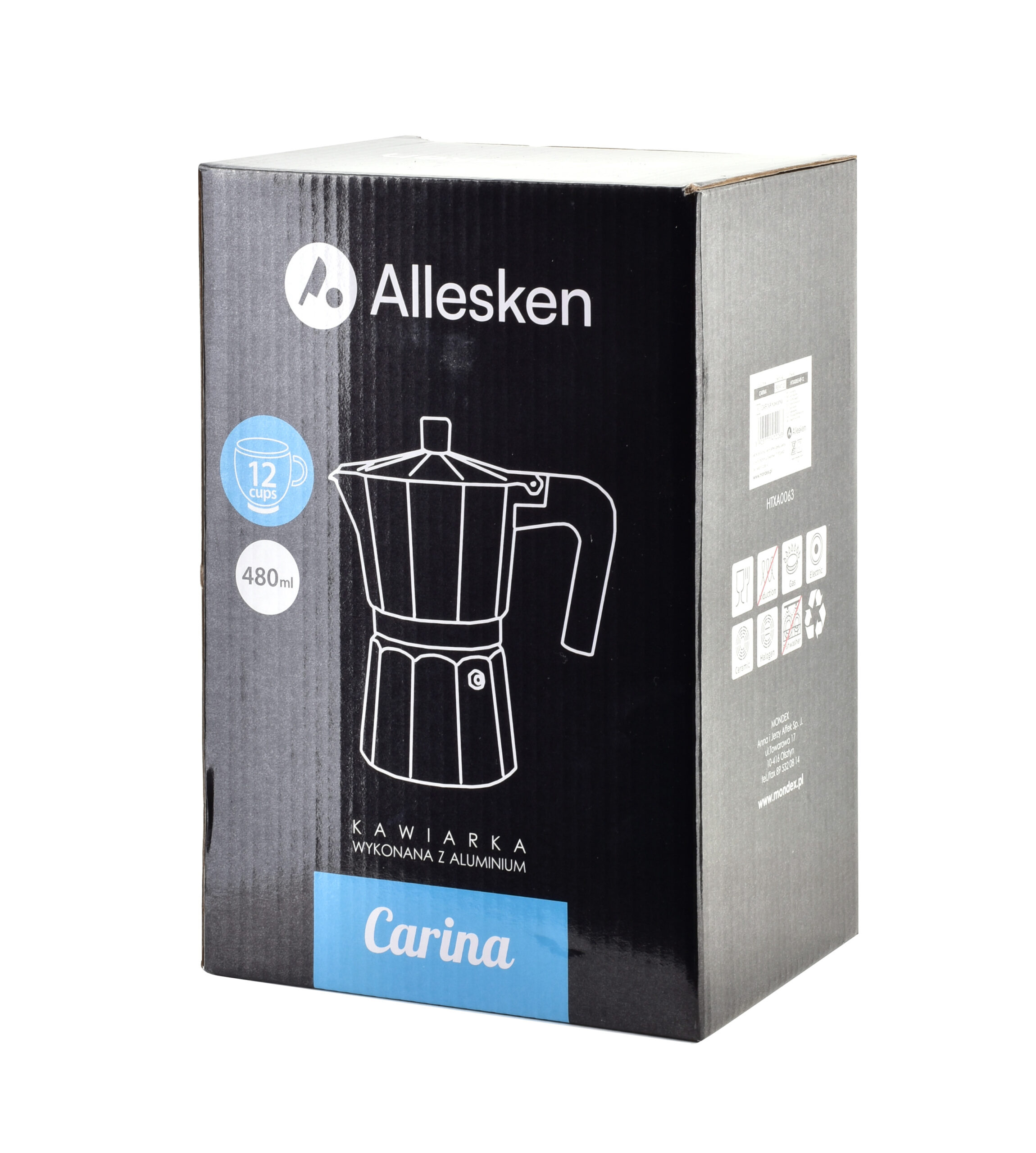 Kawiarka CARINA marki Allesken. Stylowy zaparzacz do tradycyjnego parzenia kawy. Pozwala na przygotowanie kawy o mocnym i aromatycznym smaku. Wykonany z wysokiej jakości stopu aluminium. Dolny zbiornik na wodę zabezpieczony jest zaworem, który chroni przed nadmiernym wzrostem ciśnienia pary. Nie należy myć w zmywarce. Agresywne środki chemiczne reagują ze stopem aluminium. Nie nadaje się do kuchenek indukcyjnych. Instrukcja parzenia: Do dolnego naczynia należy wlać zagotowaną wodę w ilości nie przekraczającej ciśnieniowego zaworu bezpieczeństwa. Następnie umieszczamy lejek z sitkiem, do którego wsypujemy świeżo zmieloną kawę. Wsypujemy ją po brzegi, wyrównujemy i usuwamy nadmiar. Kawy nie należy ubijać. Skręcamy oba naczynia i stawiamy na kuchence. Po kilku minutach, gdy wrząca woda przesączy się wskutek ciśnienia przez kawę w sitku, do górnego naczynia napływa zaparzona kawa. Gdy z otworu w dolnym zbiorniku zacznie wydobywać się para, kawiarkę zdejmujemy z kuchenki. Czas zaparzania 4-7 minut