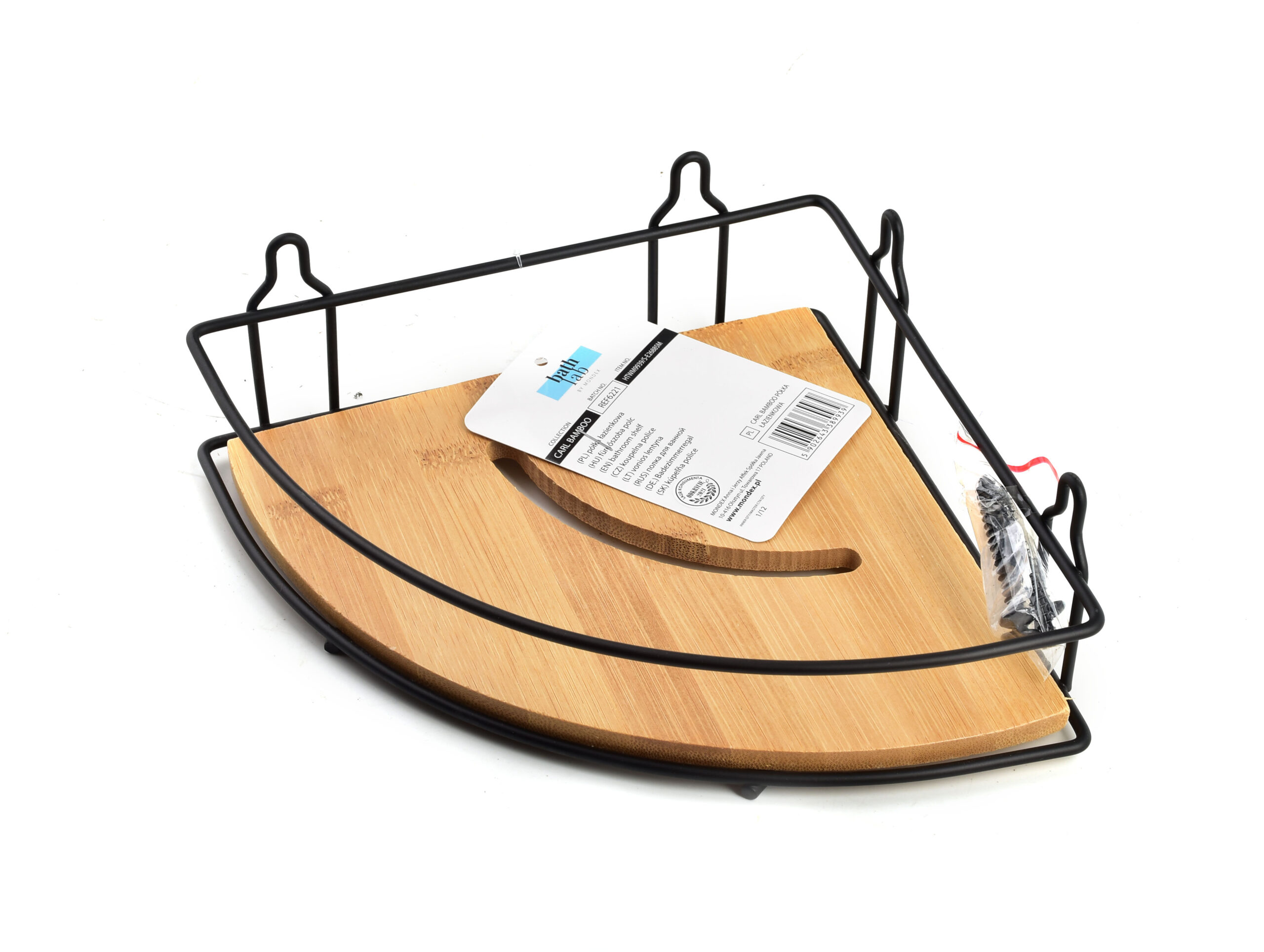 Trójkątna metalowa półka łazienkowa z serii CARL BAMBOO marki BATHLAB by MONDEX. Półka CARL BAMBOO to modne połączenie stali malowanej proszkowo oraz bambusa. Drewno bambusowe to idealny materiał do łazienki. Odporne jest na wilgoć, parę wodną oraz wodę, a jego odcień ociepli wnętrze każdej łazienki.Dołączone śruby montażowe. 1 praktyczna półka wykonana ze stali malowanej proszkowo oraz drewna bambusowego czarny mat h6.52x19x20cm