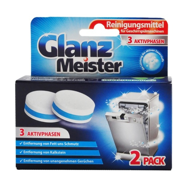 Środek do czyszczenia zmywarki GLANZ MEISTER. Wystarczy umieścić go w koszu zmywarki i włączyć tryb zmywania. Zabrudzenia i tłuszcz z filtra zostaną dokładnie usunięte. Opakowanie 2 sztuki