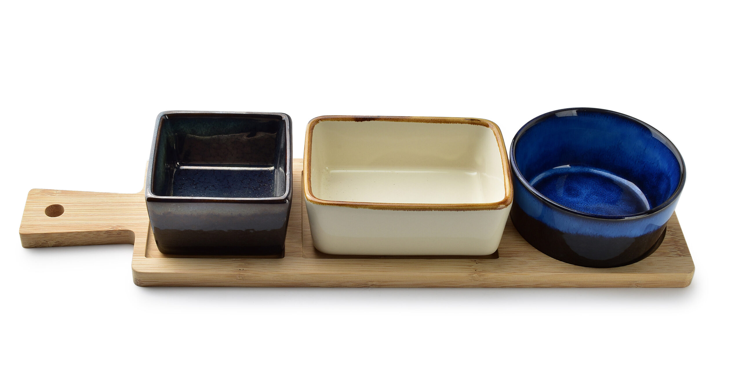 Dodaj elegancji i funkcjonalności do swojego stołu dzięki desce z miskami do serwowania przystawek MODERN KITCHEN. Ten zestaw to idealne rozwiązanie dla tych, którzy cenią sobie stylowe i praktyczne akcesoria kuchenne.Co znajdziesz w zestawie? deska do serwowania: wykonana z wysokiej jakości drewna, ta deska jest idealna do serwowania różnorodnych przystawek, przekąsek, serów, owoców i warzyw. jej naturalny wygląd dodaje ciepła i elegancji każdemu nakryciu stołu. miski do przystawek: zestaw zawiera kilka ceramicznych misek, które doskonale komponują się z deską. są idealne do serwowania sosów, dipów, oliwek, orzechów i innych drobnych przysmaków.Korzyści z posiadania deski z miskami do serwowania MODERN KITCHEN: wszechstronność: deska z miskami jest idealna do serwowania różnorodnych potraw . od serów i wędlin, przez przystawki i przekąski, po owoce i warzywa. jej wszechstronność czyni ją niezastąpioną w każdej kuchni. estetyka i elegancja: naturalne drewno deski i eleganckie miski tworzą harmonijną całość, która podnosi estetykę serwowanych potraw i dodaje uroku każdemu posiłkowi. trwałość i jakość: wykonana z wysokiej jakości materiałów, deska jest wytrzymała i odporna na codzienne zużycie. ceramiczne miski są trwałe i łatwe do czyszczenia. funkcjonalność: kompaktowe wymiary deski i misek sprawiają, że zestaw jest łatwy do przechowywania i doskonale nadaje się do codziennego użytku oraz na specjalne okazje. łatwość czyszczenia: zarówno deska, jak i miski są łatwe do utrzymania w czystości, co sprawia, że ich użytkowanie jest niezwykle wygodne.Podnieś jakość swoich serwowanych potraw dzięki desce z miskami do serwowania MODERN KITCHEN. Ciesz się nowoczesnym designem, funkcjonalnością i wyjątkowym smakiem potraw, które przygotujesz i podasz na tym eleganckim zestawie.Wymiary:deska drewniana: 34x9cmmiska granatowa: 9xh4cm głębokość:3,5cmmiska beżowa: 10x7xh4cm głębokość: 3cmmiska grafitowa: 7x7xh4cm głębokość: 3cm