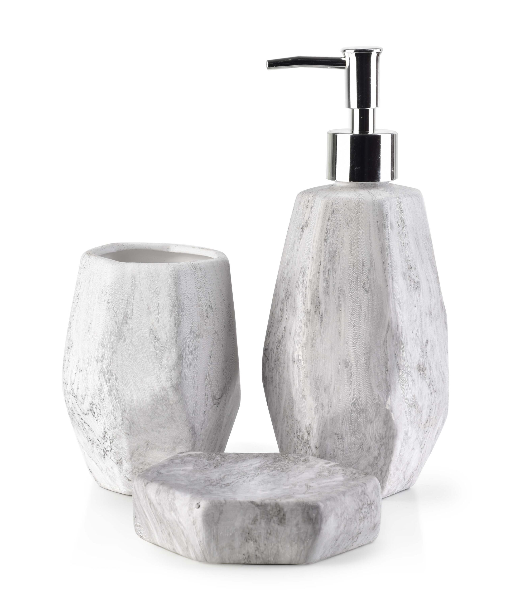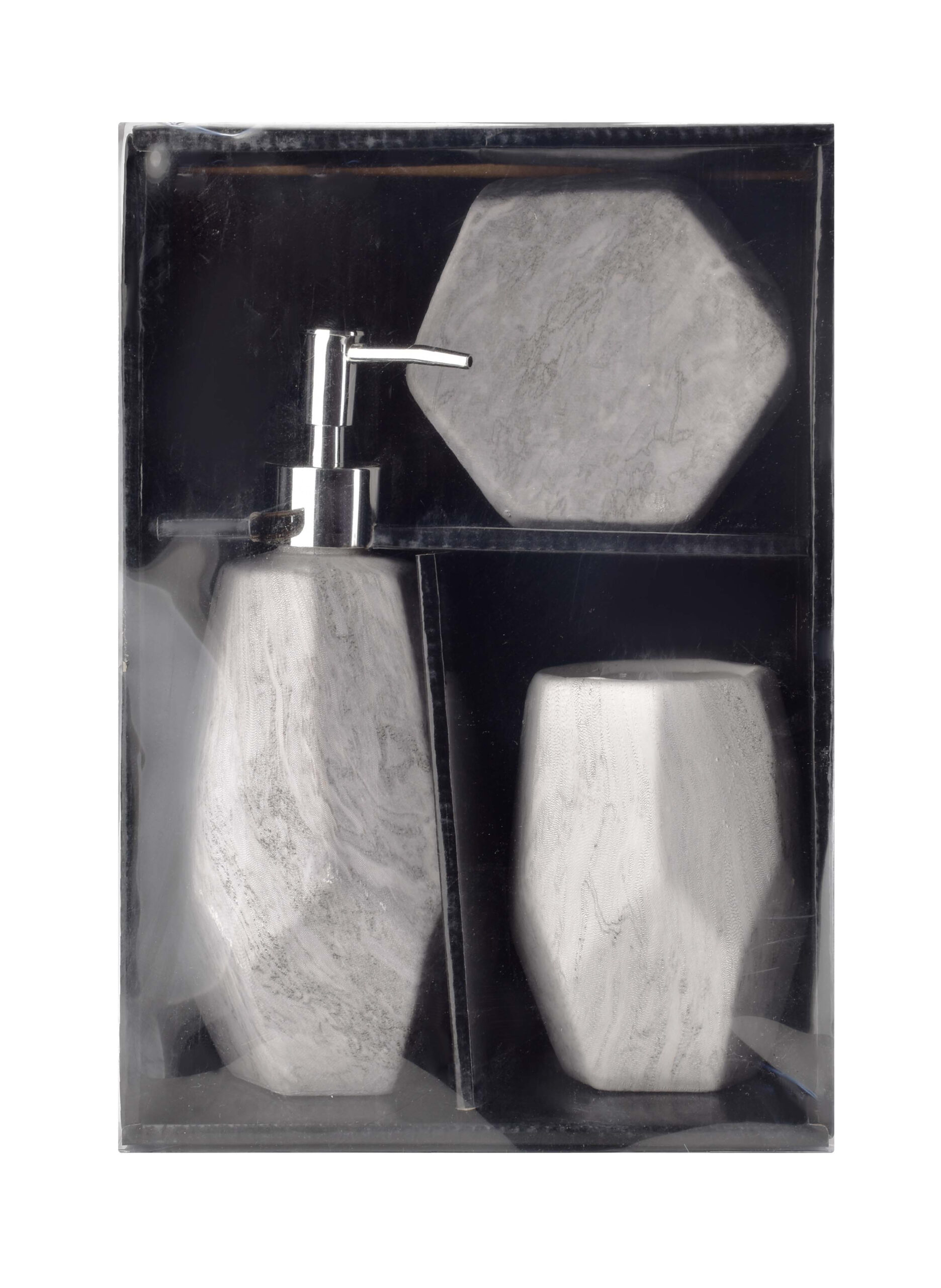 Trzyczęściowy matowy zestaw składający się z dozownika na mydło w płynie lub balsam, mydelniczki oraz kubka na przybory. dozownik 9x9xh22cm / poj.480ml kubek 9x9xh11,5cm podstawka:10,5x11xh3cm
