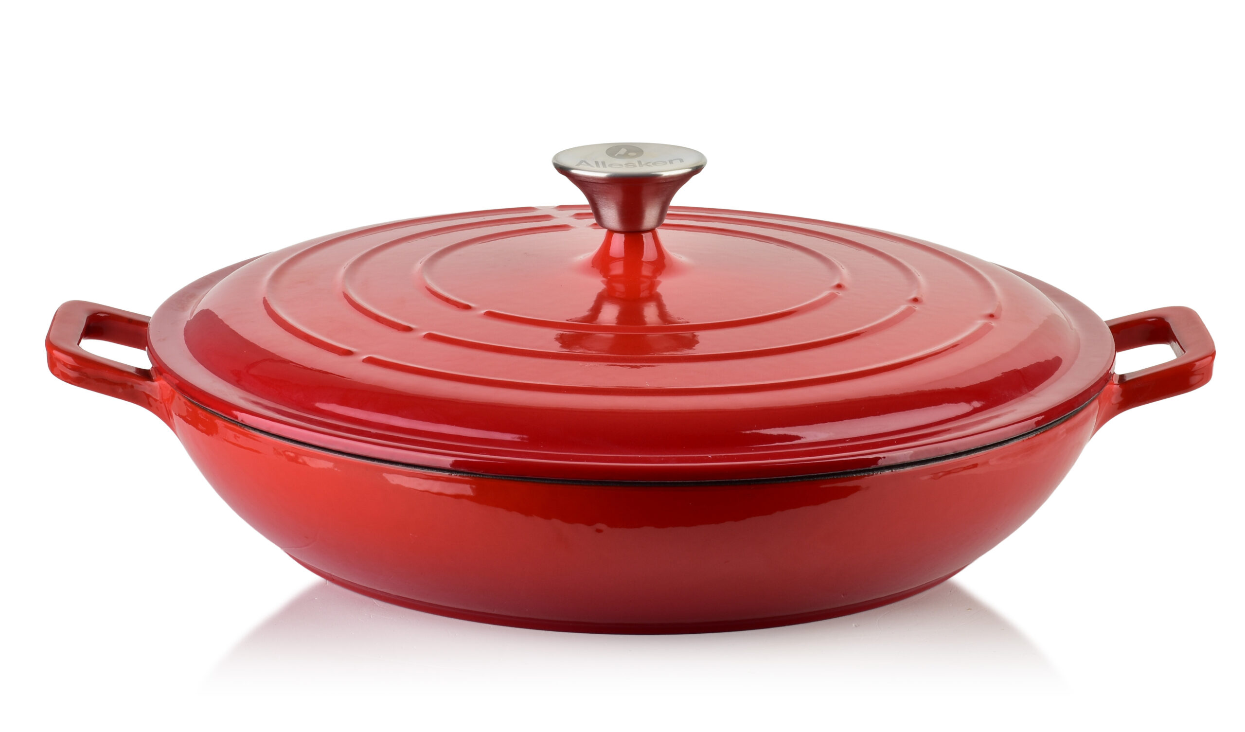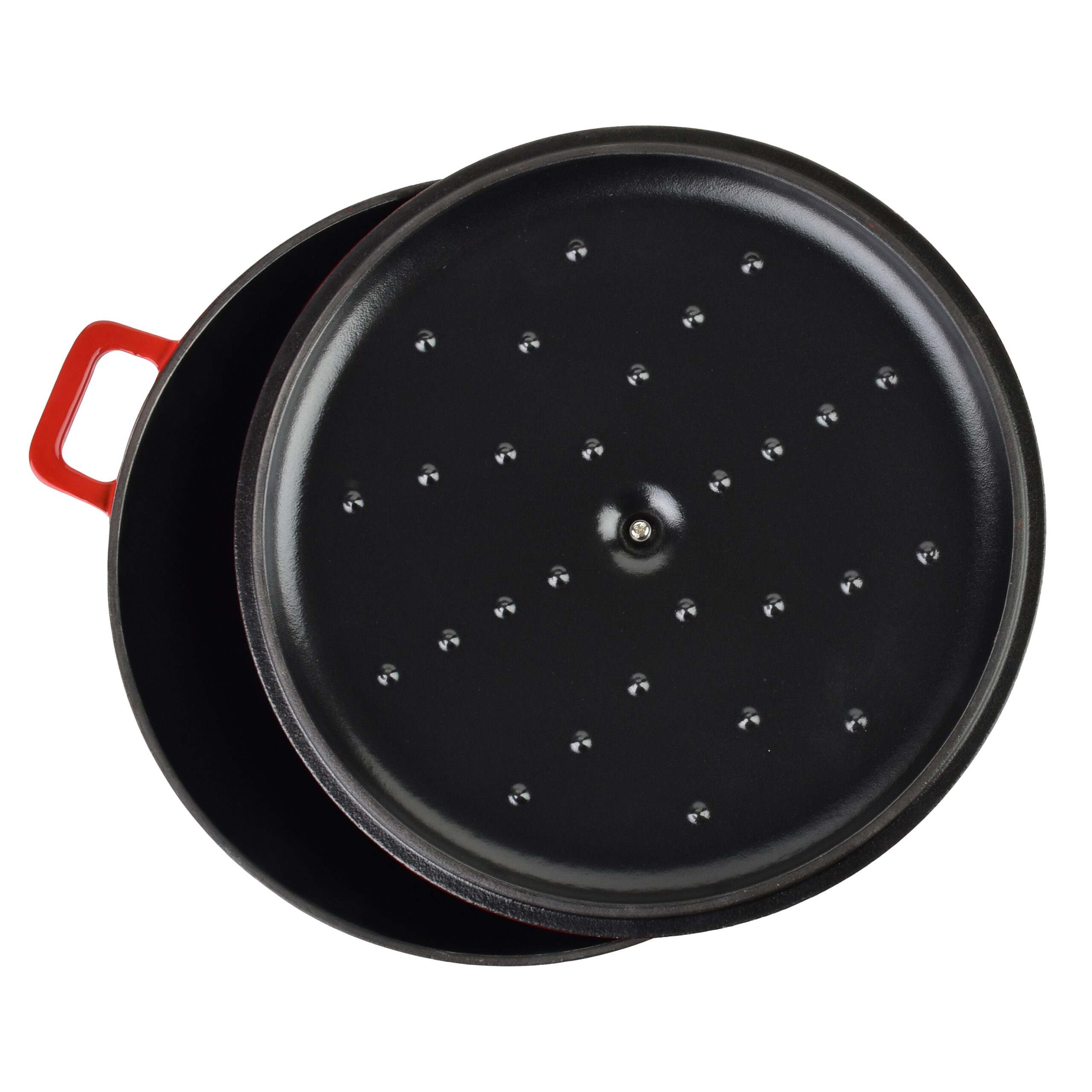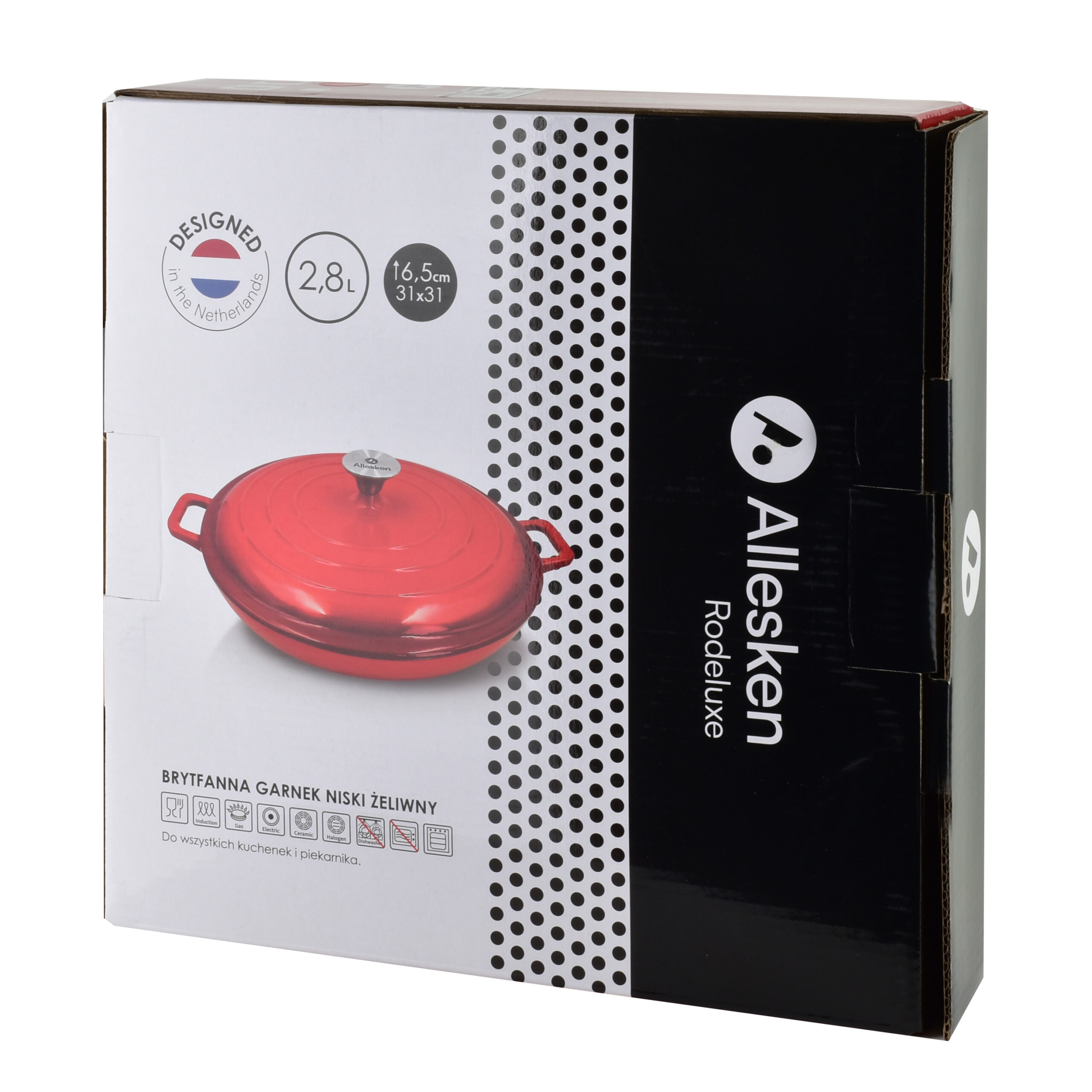 RODELUXE Brytfanna niska żeliwna emaliowana 31x31x6cm o pojemności 2,8L.Brytfanna żeliwna w kolorze czerwonym z serii RODELUXE to wysokiej jakości naczynie kuchenne, które jest idealne do przygotowywania różnorodnych potraw, w szczególności duszonych mięs, zapiekanek oraz pieczeni. Oto kilka cech charakterystycznych takiej gęsiarki: Materiał: Wykonana z solidnego żeliwa, które zapewnia równomierne rozprowadzanie ciepła oraz długotrwałe utrzymywanie temperatury. Kolor: Elegancki czerwony kolor, który dodaje stylu każdej kuchni. Pokrywa: Żeliwna pokrywa zapewniająca szczelność oraz optymalne warunki do duszenia potraw. Rączki: Ergonomiczne uchwyty ułatwiające przenoszenie naczynia, nawet gdy jestgorące. Seria RODELUXE: Charakteryzuje się wyjątkowym designem oraz najwyższą jakościąwykonania. Takie naczynie jest nie tylko funkcjonalne, ale również stanowi piękny element wyposażenia kuchni. Idealne dla miłośników gotowania, którzy cenią sobie trwałość i estetykę swoich narzędzi kuchennych.wymiar: 31x31xh6cm z pokrywą waga:5,5kg zapakowana jednostkowo w color box:33x33x8cm
