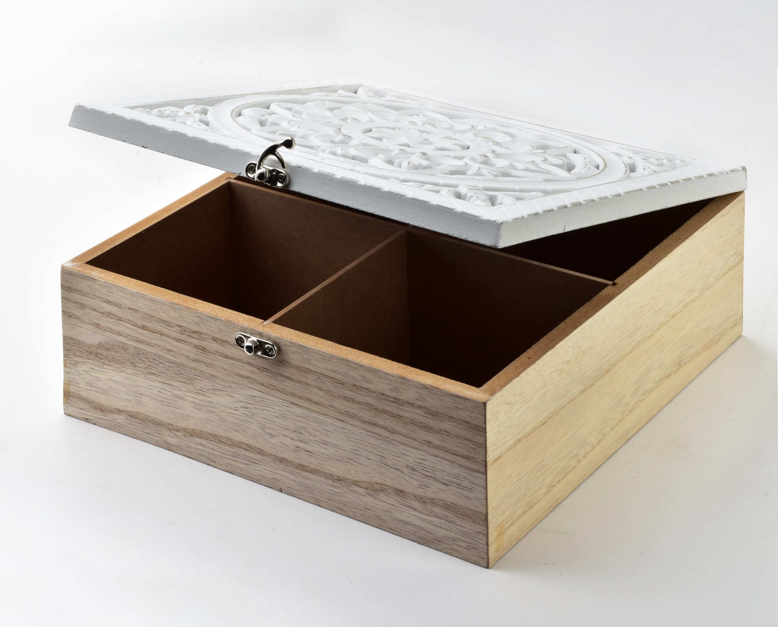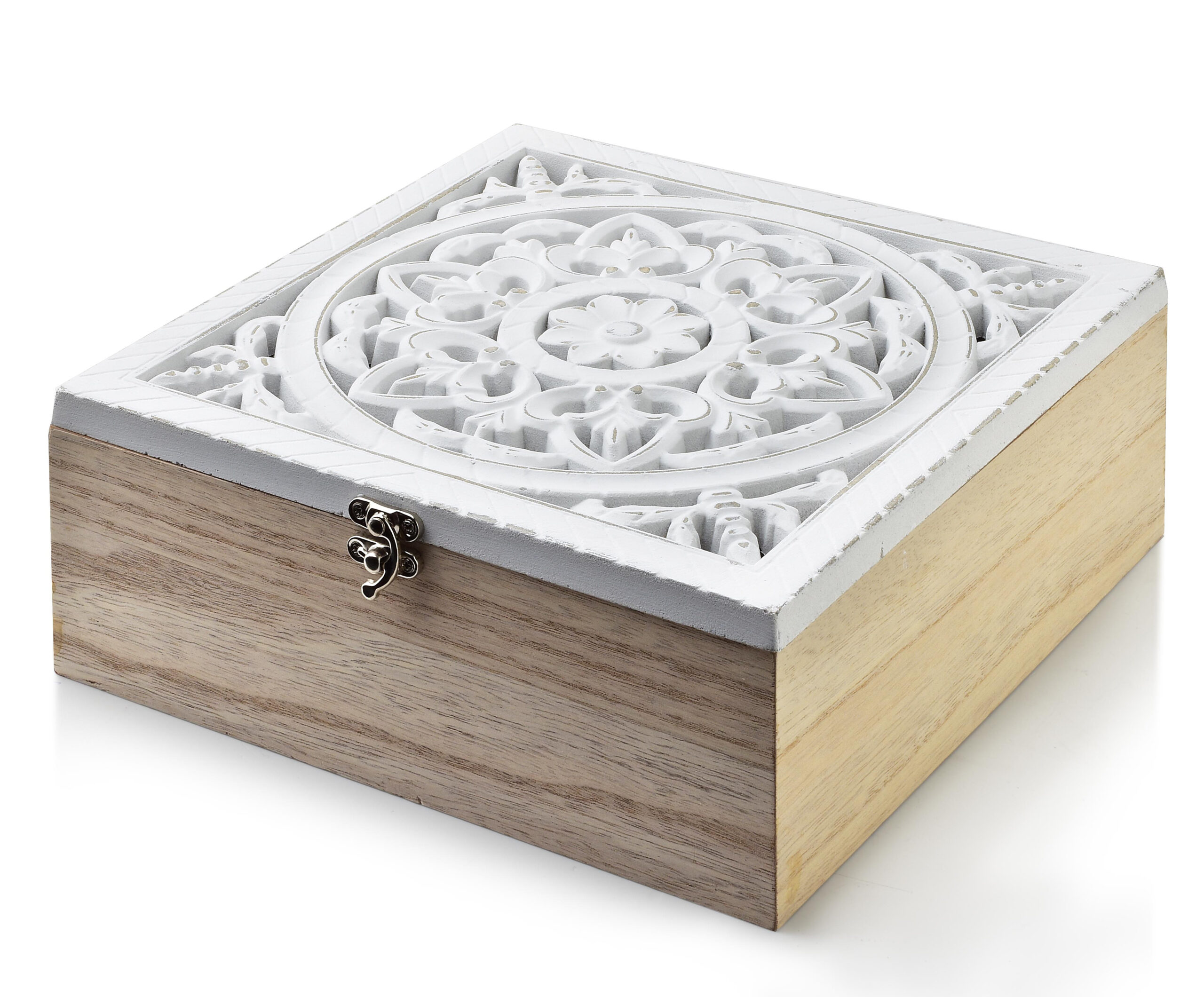 Pudełko SADIE marki MONDEX since 1986 na herbatę z 4 przegródkami. Wartościowe chwile wymagają odpowiedniej oprawy i nic nie podkreśla ich tak, jak ulubiona herbata serwowana w elegancki sposób. Przedstawiamy pudełko na herbatę z 4 przegródkami. Niezastąpiony element każdej kuchni lub salonu dla miłośników tego aromatycznego napoju. Pozwala na schludne przechowanie różnych rodzajów herbaty. Dzięki temu łatwo utrzymasz porządek i szybko znajdziesz ulubiony smak. Klasyczna elegancja drewnianego wykończenia sprawi, że pudełko stanie się nie tylko praktycznym, ale i dekoracyjnym elementem. Pasuje do każdego wnętrza dodającmu charakteru. Wykonane z solidnych materiałów, gwarantuje stabilność i długowieczność, chroniąc jednocześnie Twoje herbaty przed wilgocią i zanieczyszczeniami. Możliwość przechowywania nie tylko herbat, ale również innych drobnych przedmiotów, sprawia, że pudełko jest wielofunkcyjne. wymiary:23x23xh9cm waga: 994g/1070kg z opakowaniem zapakowane jednostkowo w brązowy box: 24x10xh24cm przecierać wilgotną szmatką przegródka: 10,5×10,5cm
