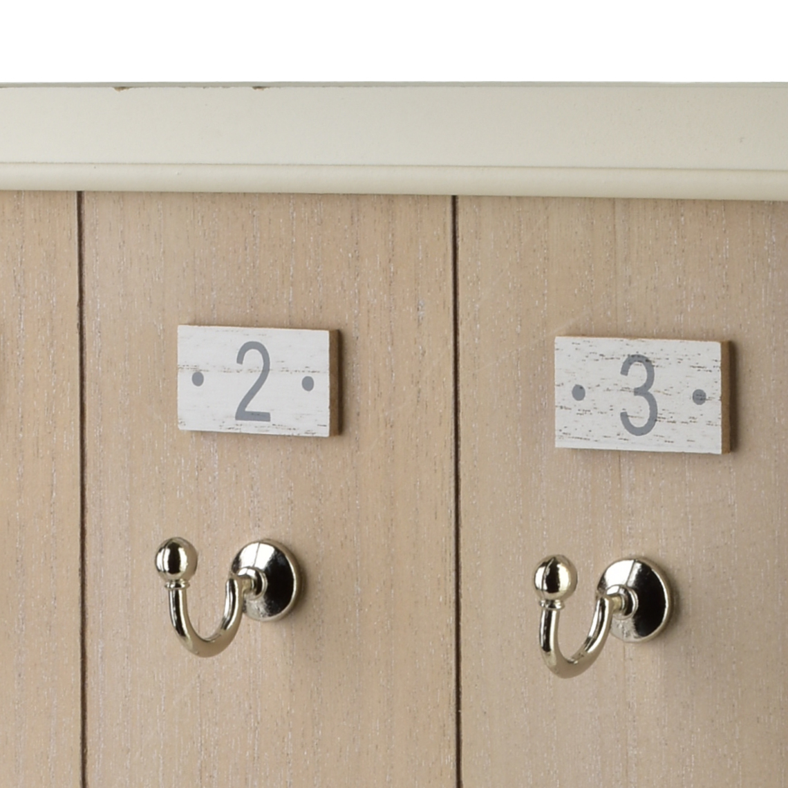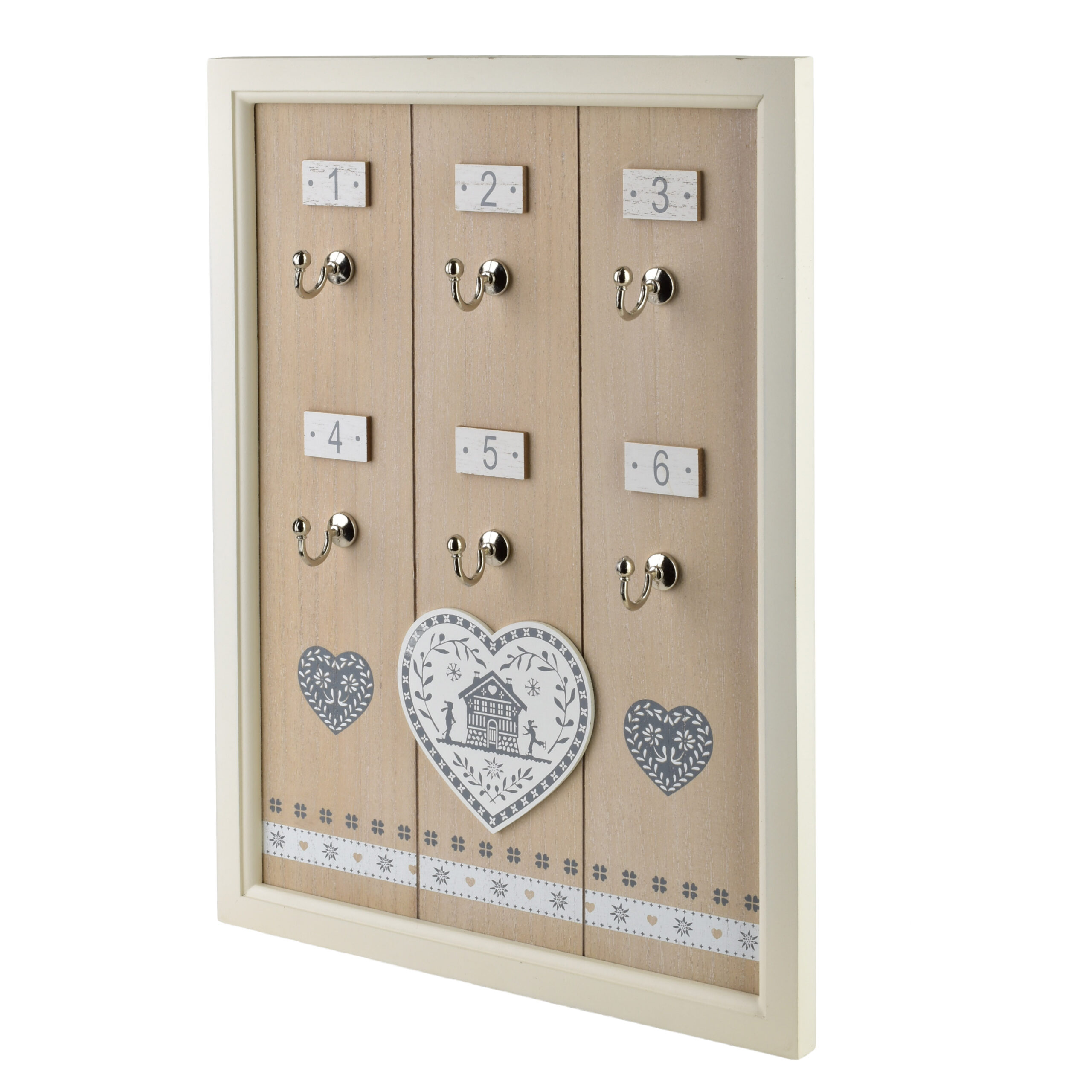 Ramka na klucze STACY to elegancki element wystroju, wykonany z drewna o wymiarach 40x30x1,5 cm. Została zaprojektowana z myślą o praktycznym przechowywaniu kluczy lub innych drobiazgów. Na drewnianej powierzchni umieszczono sześć wieszaków, które idealnie pasują do zawieszenia kluczy, breloczków czy małych akcesoriów. Ramka wyróżnia się subtelnym zdobieniem w postaci drobnych serc, co nadaje jej uroku i delikatności. Kolorystyka w odcieniach bieli i szarości sprawia, że pasuje do wielu wnętrz, tworząc ciepłą, przytulną atmosferę. Idealna do zawieszenia w przedpokoju, kuchni lub nawet w sypialni, gdzie może pełnić funkcję zarówno praktyczną, jak i dekoracyjną.