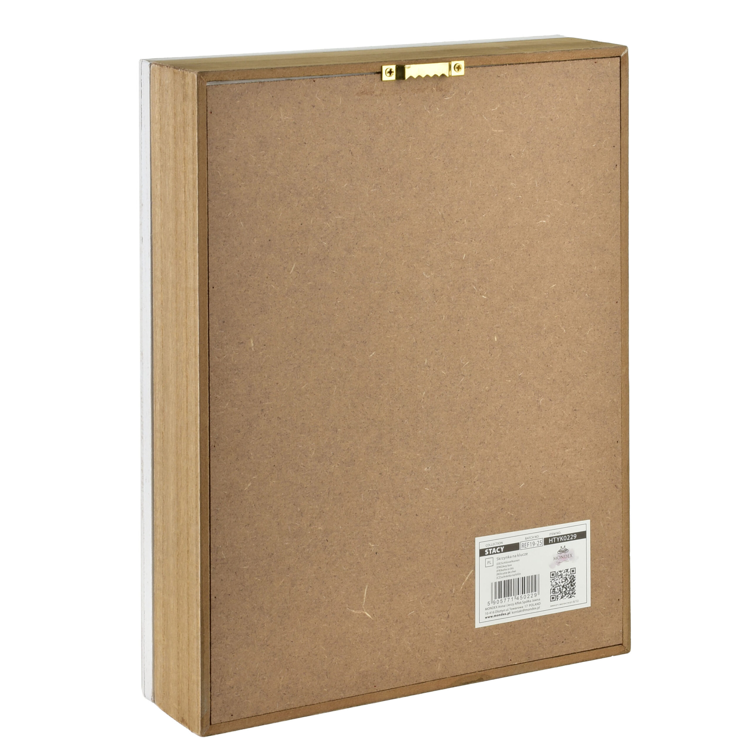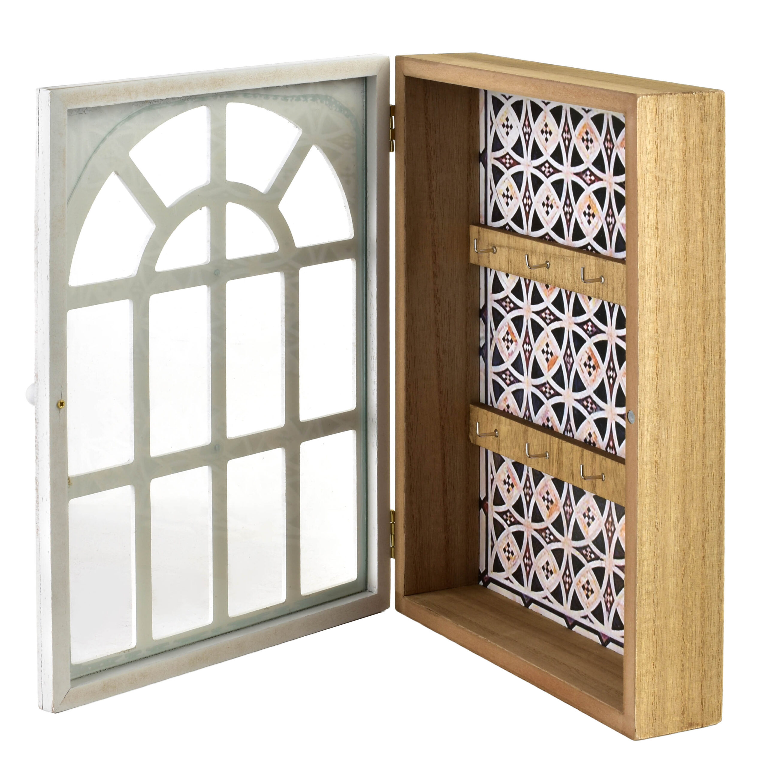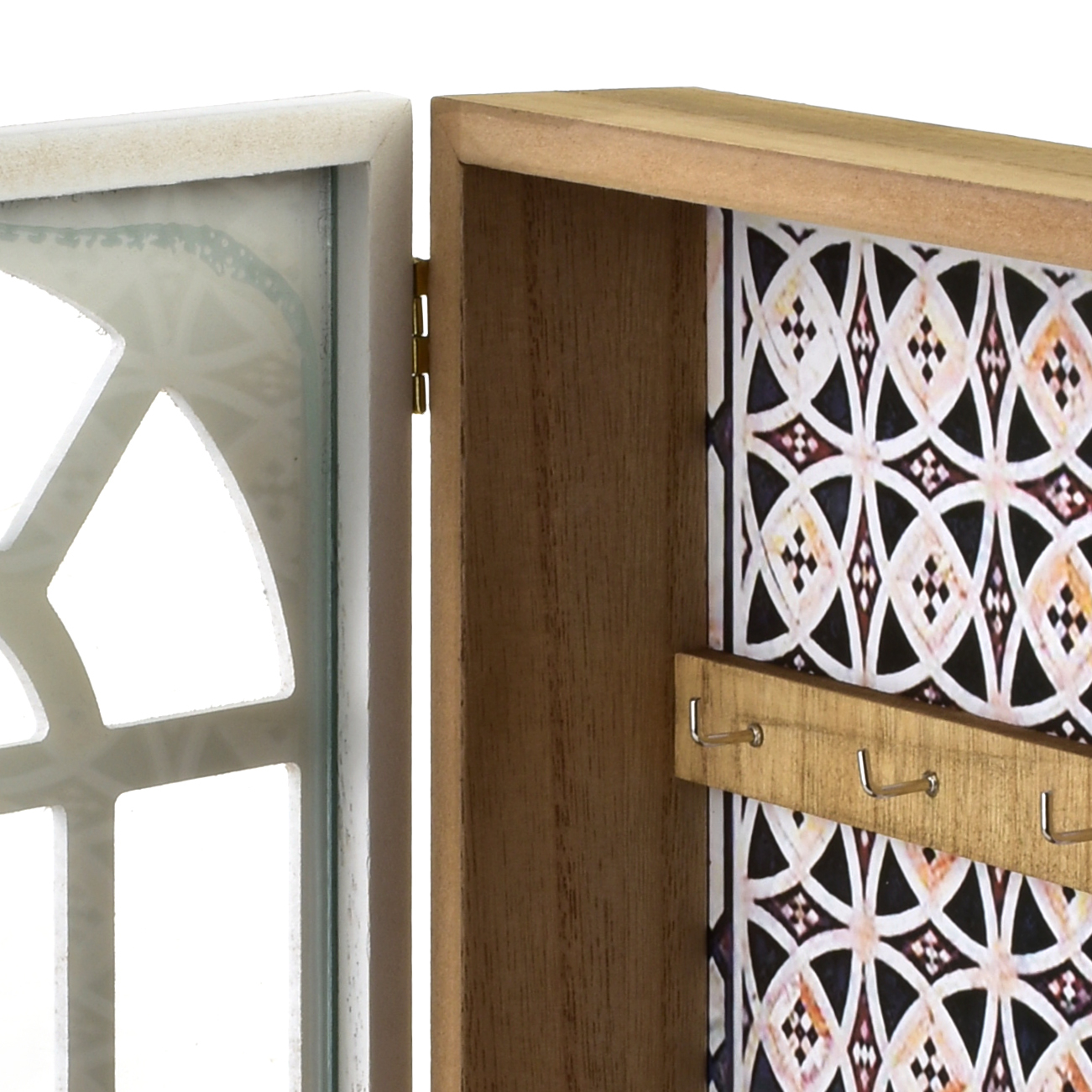 Skrzynka na klucze STACY o wymiarach 28×21,5×6 cm w kolorze białym, inspirowana starodawnym oknem łukowym, to elegancki i unikalny element wystroju. Jej kształt i wykończenie imitują klasyczne okno z charakterystycznymi szprosami, nadając jej subtelny, vintageowy wygląd. Wnętrze skrzynki zostało ozdobione przepięknym marokańskim tłem, które dodaje jej egzotycznego, artystycznego uroku. Została wyposażona w sześć wieszaków, idealnych do przechowywania kluczy, breloczków i innych drobiazgów. Biała kolorystyka i stylowy design sprawiają, że skrzynka doskonale komponuje się w różnych aranżacjach wnętrz, od klasycznych po te inspirowane stylem boho czy marokańskim. To połączenie funkcjonalności z wyjątkową estetyką, które wprowadza do przestrzeni ciepło i elegancję. Idealna do przedpokoju, salonu lub nawet sypialni.