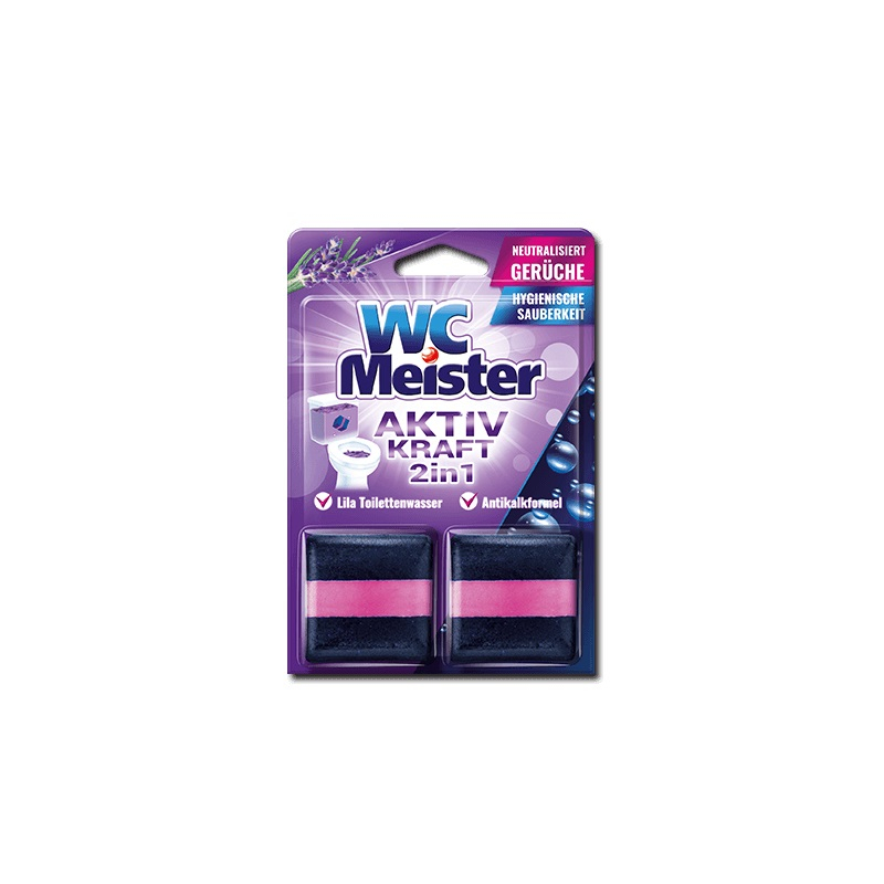 WC Meister kostka barwiąca do spłuczki Lawenda. Opakowanie zawiera dwie kostki po 50g. Waga: 100g.